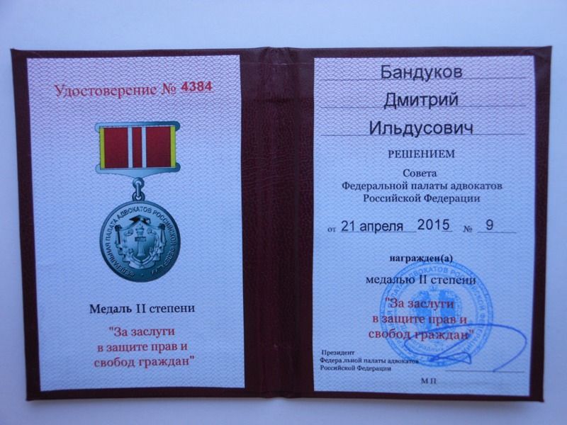 В 2015 г. Советом Федеральной палаты адвокатов Российской Федерации награжден медалью 2-й степени «За заслуги в защите прав и свобод граждан».